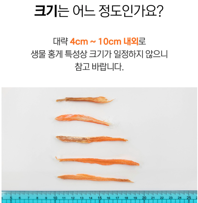 상세페이지에도 안내되어 있듯, 게살을 직접 말린 거라 모양도, 길이도 정말 제각각이다.