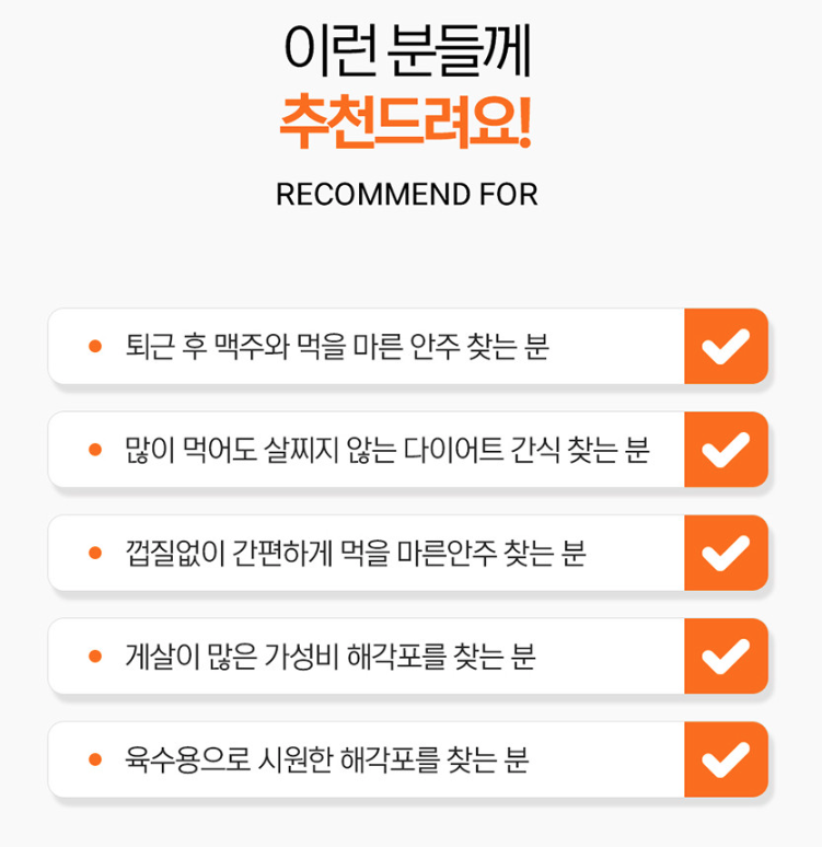 다이어트할 때 꼭... 사두는 게 입 심심할 때 씹을 수 있는 것, 그렇지만 칼로리나 당이 과하지 않는, 다이어트에 적합한 그런 것...! 흔히 알려진 건 카카오닙(스?)인데, 누군가 해각포를 추천하길래 이번에 사봤다. 사실 그전까지 해각포라는 게 뭔지도 몰랐는데 알고 보니 게 다리살을 육포처럼 포로 만든 것! 해산물 좋아하는 편이고, 게도 좋아하는 편이라 혹했던 건 사실인데 이게 검색해 보니 가격이 만만치가 않아서 잠시 고민했었다. 그래도 너무 궁금해서... 검색해서 추천 글/댓글 중 광고 같지 않은 것들을 추려서 알아보다 보니, 비슈마켓 해각포로 결정하게 됐다.