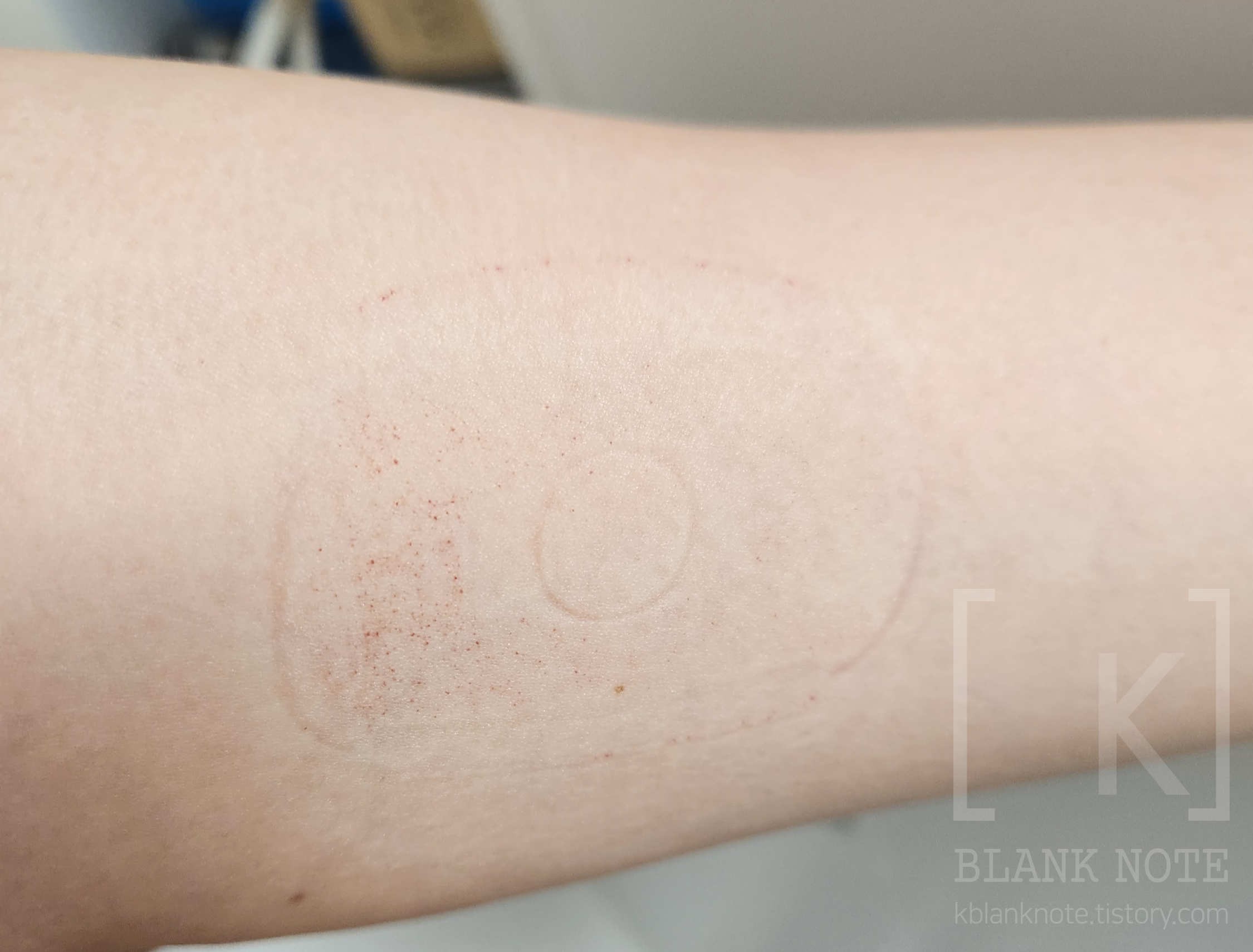 왼쪽 이미지는 팔 안쪽 1회 사용시 흔적, 오른쪽 이미지는 팔 안쪽 2회 차 사용 시 흔적.