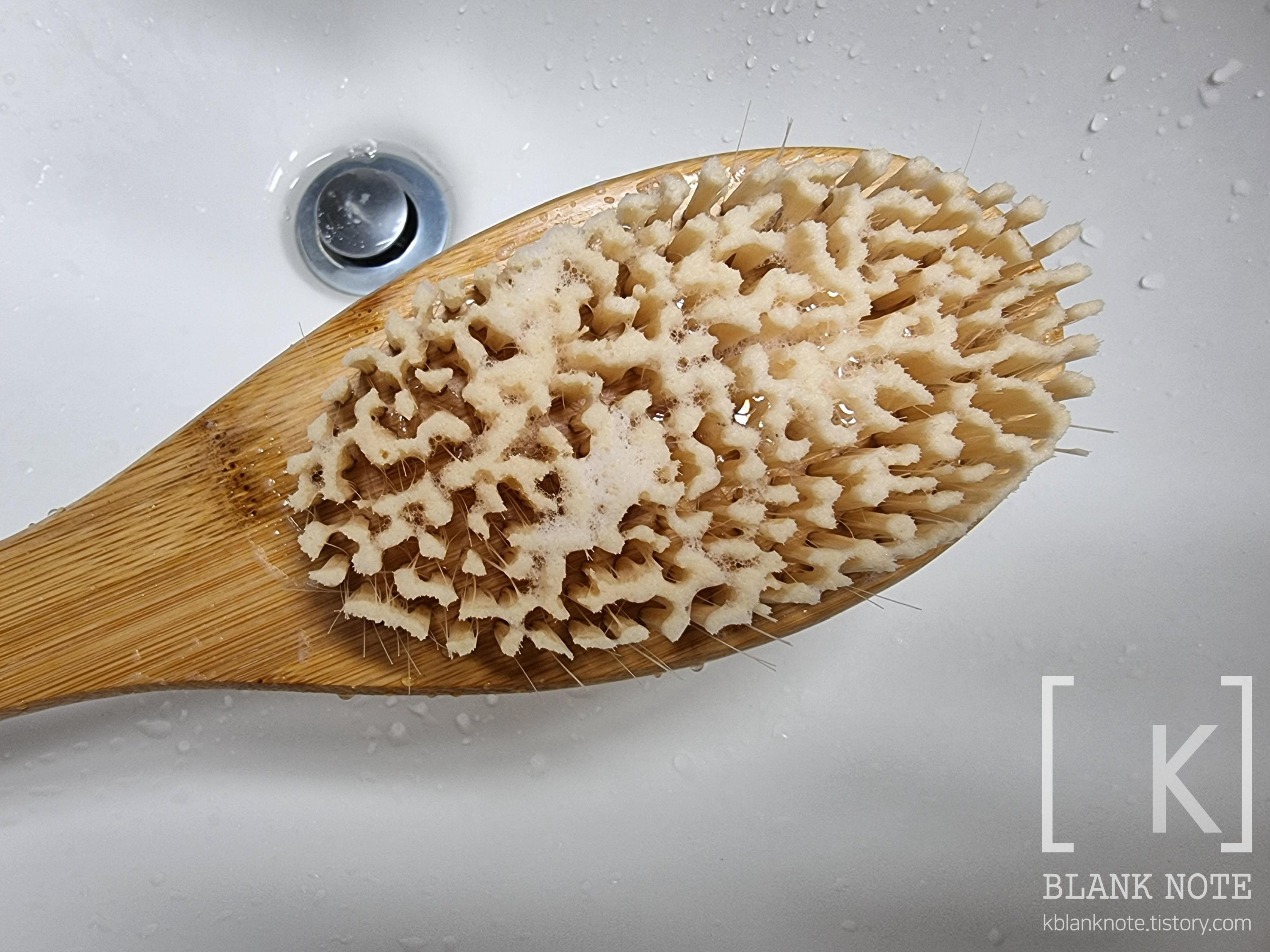 3. 핸들이 미끄럽다. 개인적으로 느낀 가장 큰 단점. 몸에 비누칠 한 상태에서 문질문질 하게 되는데, 이때 핸들 부분은 바디샴푸 거품/비누를 씻어낸 다음에 씻은 손으로 잡고 사용해야 한다. 그마저도 사실 사용하다보면 브러쉬 사용 각도가 계속 바뀌는데, 비누 거품이 핸들로 흘러 내려(?)오기 때문에...결국 시간 조금 지나면 미끄러워짐.