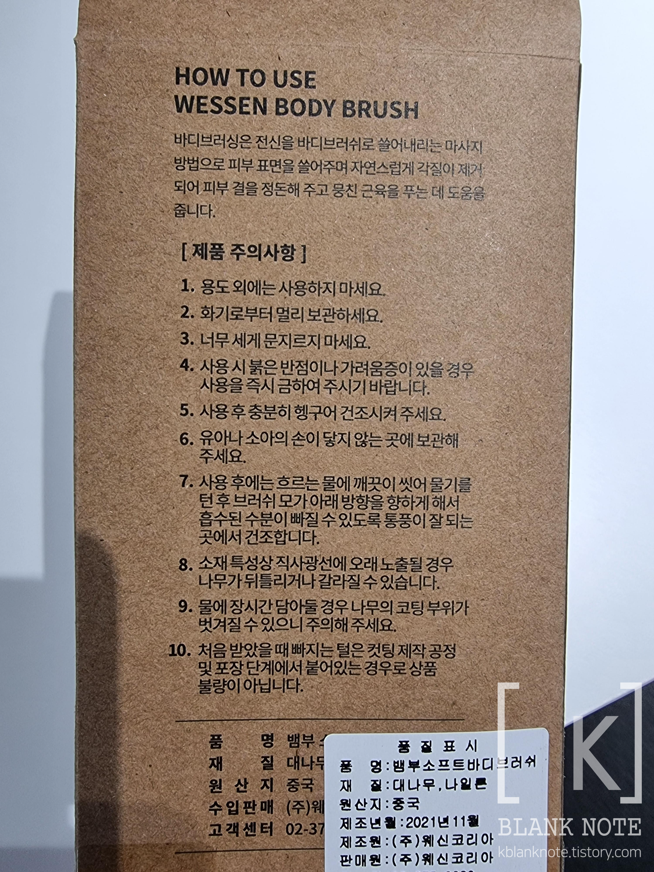 역시 대나무 재질이 맞군. 원산지 중국이라 되어있으니 아무래도 제작도 중국이겠..지..? 샤워하며 바디브러쉬를 사용해서 피부 각질을 제거하고 뭉친 근육을 풀어주는 마사지 효과를 얻을 수 있다고 안내되어있는데, 나는 과하지 않은 정도로 피부 각질 제거 목적으로 구매하긴 했다. 브러싱이 뭉친 근육을 풀어주는 마사지...까지 되는지는 좀 회의적이지만, 개운함을 느끼긴 했다. 근데 이건 마사지 효과는 아니고 그냥... 뽀득뽀득 잘 씻긴것 같아서...