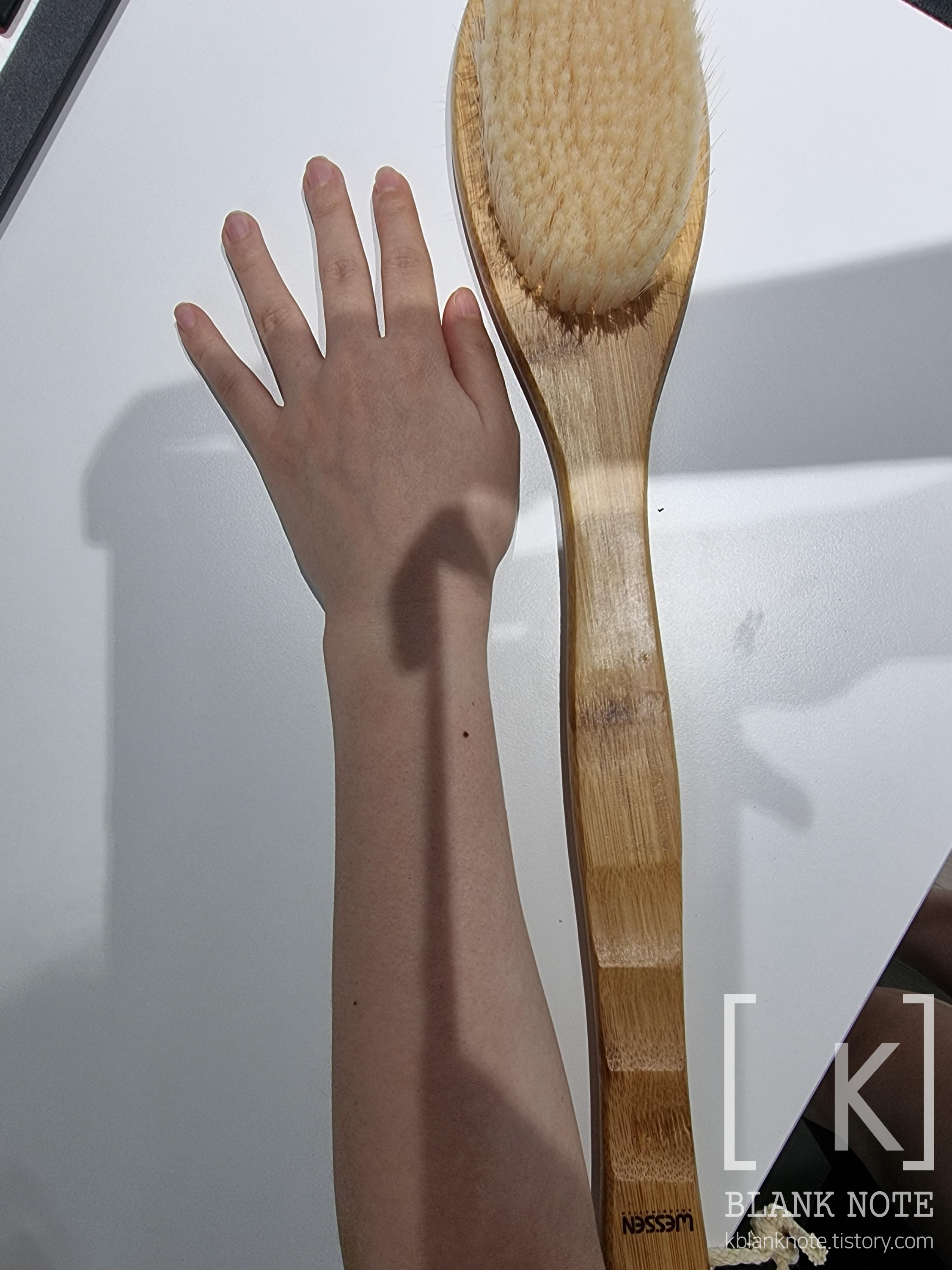 1. 가벼운 (준)데일리 각질 제거 목적에 부합하다. 피부 강도에 따라 다르겠지만 나는 피부가 예민하진 않지만 약한 편이어서, 초보용 브러쉬라는 뱀부 소프트가 잘 맞았다. 손으로 쓸어봤을땐 상당히 부드러웠는데, 막상 바디샴푸 묻혀서 몸에 문질렀을때는 또 그렇게 부드럽다 느껴지진 않았다. 다 씻고 나서 피부 만져보니 어느정도 각질 제거된건 맞는듯 싶었다.
