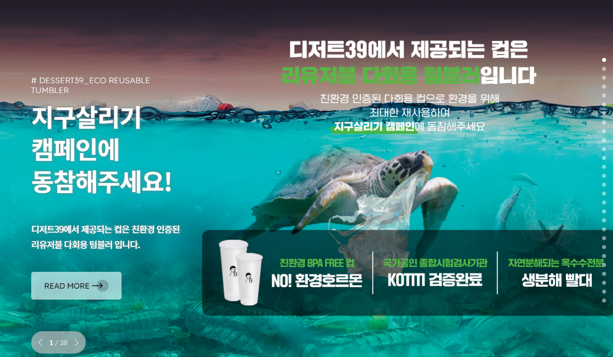 디저트39에서는 저렇게 리유저블 플라스틱 컵으로 배달해준다. 홈페이지 가보니까 이렇게 메인에 가장 먼저 띄워놓은것 보면 디저트39에서 홍보하고 싶은 브랜드 강점, 뭐 그런걸까 싶기도. 실제로 디저트39에서 배달을 시키게 될 경우 컵 씻어서 여러번 사용 후 분리수거하고 있다.