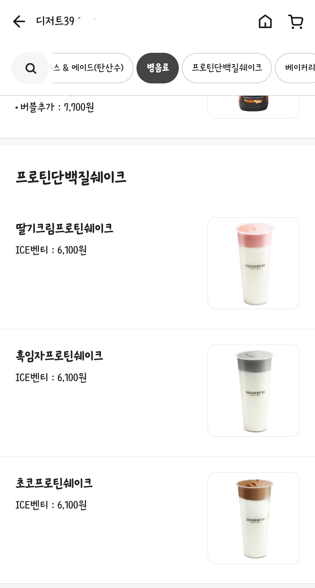 디저트39 사이트 가보니까 프로틴 음료 종류가 이렇게나 많은데, 주위 배달 가능한 지점들 중 저렇게 많이/다양하게 취급하는 곳은 없었다. 오히려 홈페이지에는 없는 초코크림프로틴쉐이크랑 딸기크림프로틴쉐이크는 있음(?)