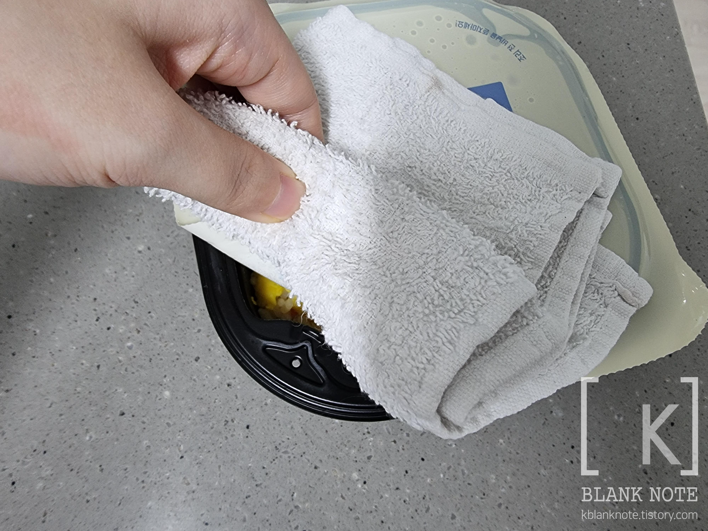 다 돌리고 나서 꺼내보면 상당히 뜨겁다. 이때 모서리 한 쪽을 잡고 비닐을 뜯어내면 된다. 비닐 자체는 잘 뜯기는데, 문제는 내부 뜨거운 수증기가 확 나와서 손을 딜 가능성이 있다는 것. 실제로 생각없이 뜯다가 몇 번 당한 뒤로는 저렇게 행주를 대고 뜯는다.