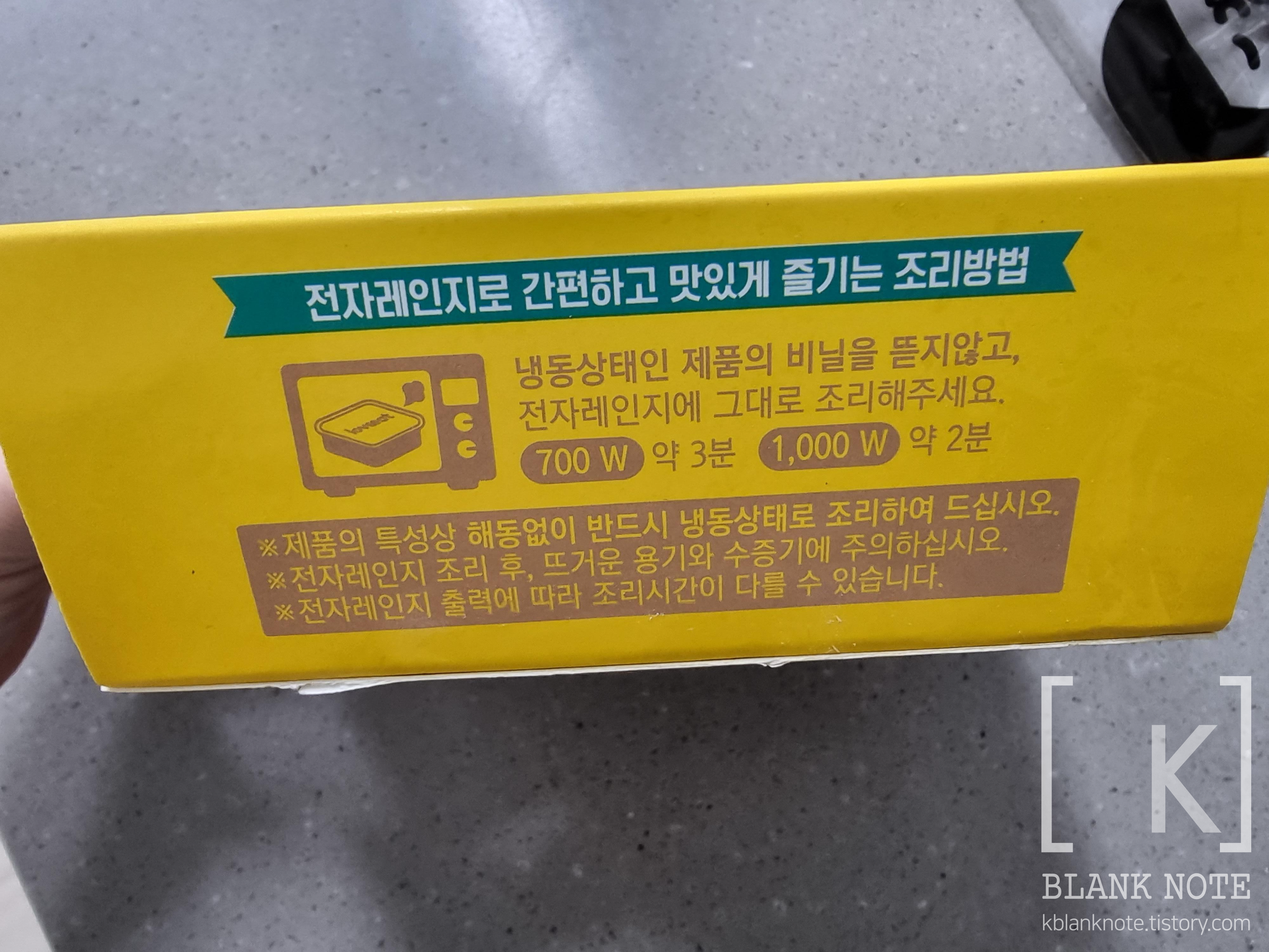주의할 점: 이 제품의 노란색 종이 커버를 벗기고 나면 비닐 포장된 플라스틱 용기가 나오는데, 그 비닐 포장을 뜯으면 안된다. 그대로 전자렌지에 넣고 전자렌지 출력에 따라 2분~3분가량 돌려주면 조리 끝.
