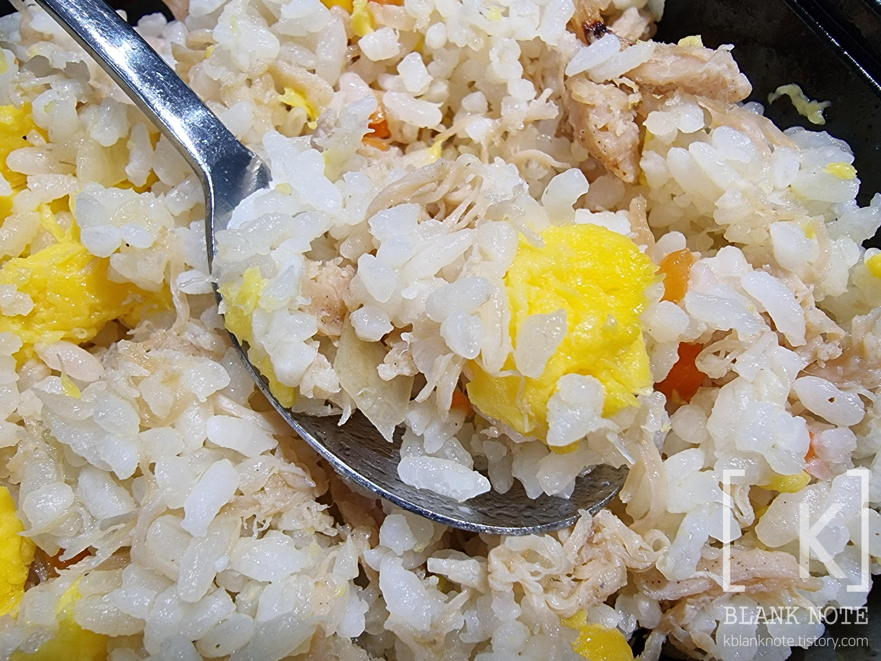 안에 보면 이렇게 스크램블 에그와 닭가슴살이 뭉쳐있다. 밥과 잘 섞이도록 풀어서 정리해준 후 먹으면 된다. 간이 주로 닭가슴살에 되어 있기 때문에 (짭쪼롬하다) 닭가슴살만 뭉쳐서 먹으면 좀... 짜고 남은 밥이 맛없게 느껴질 수 있다.