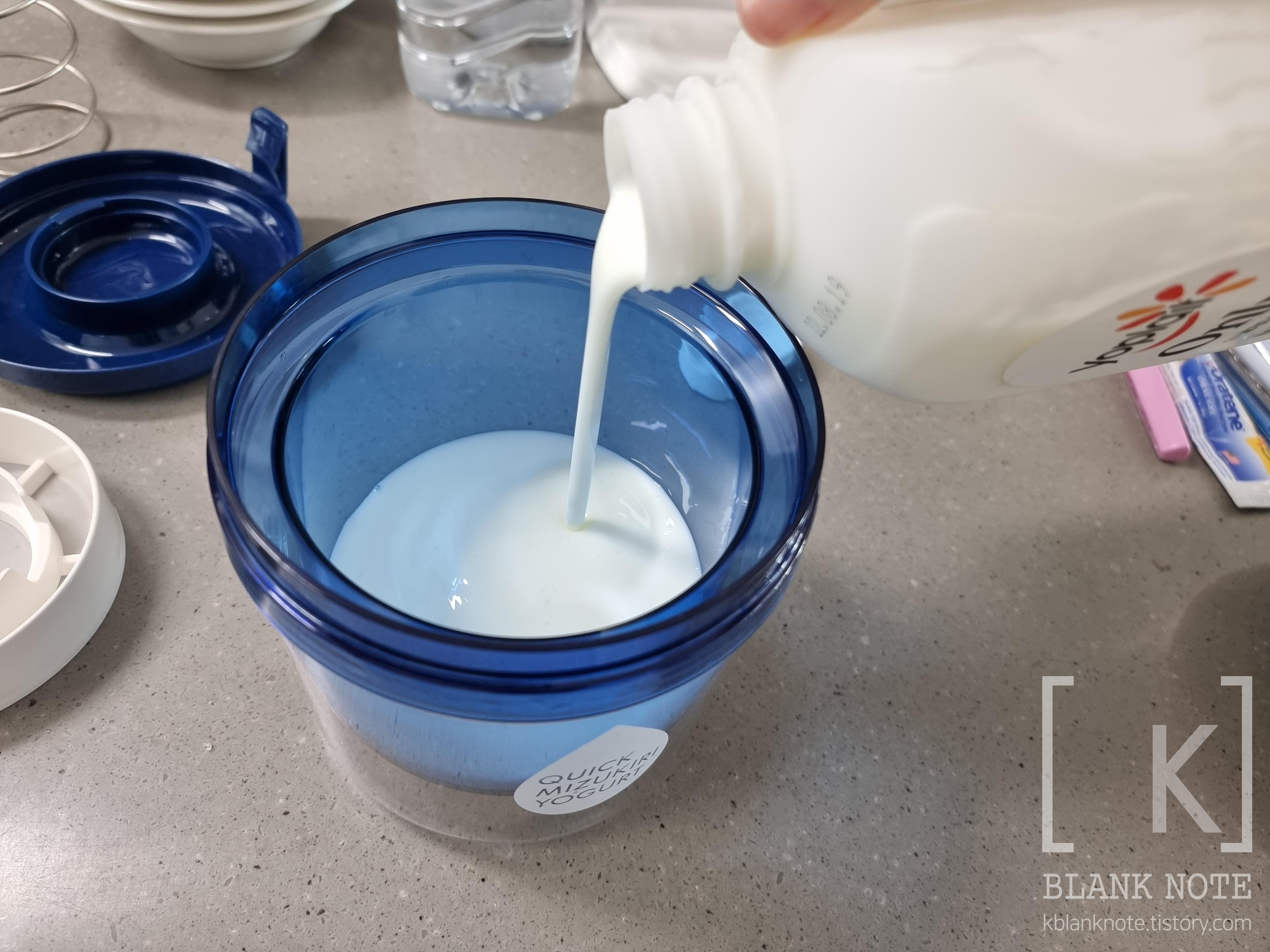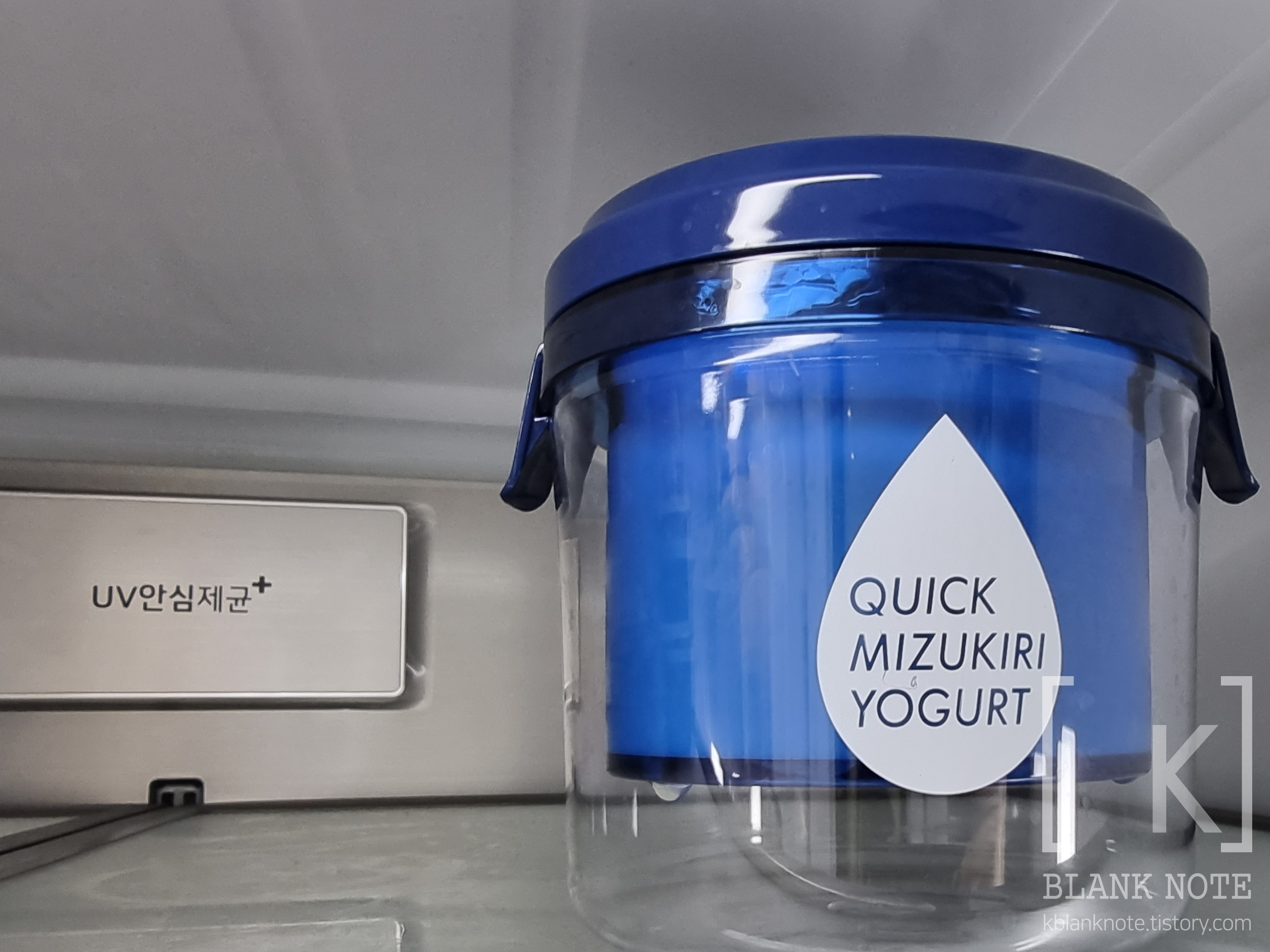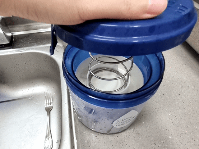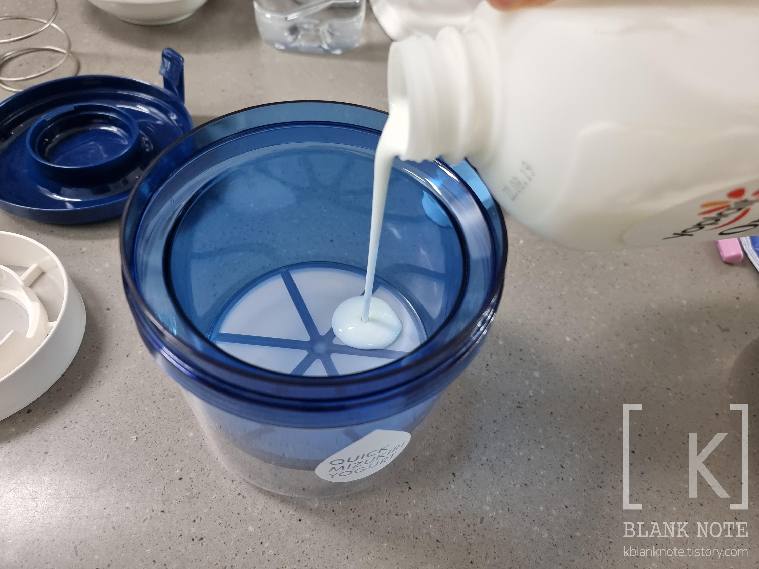 하얀 망을 요거트 윗부분에 올려준 후, 파란색 통 뚜껑을 닫아준 다음에 냉장고에 넣어준다. 이때 스프링 없이 그냥 뚜껑만 닫아야 한다 (중요). 스프링을 바로 장착하면 망 사이로 비집고 나오는 요거트 대환장 파티가 벌어진다.