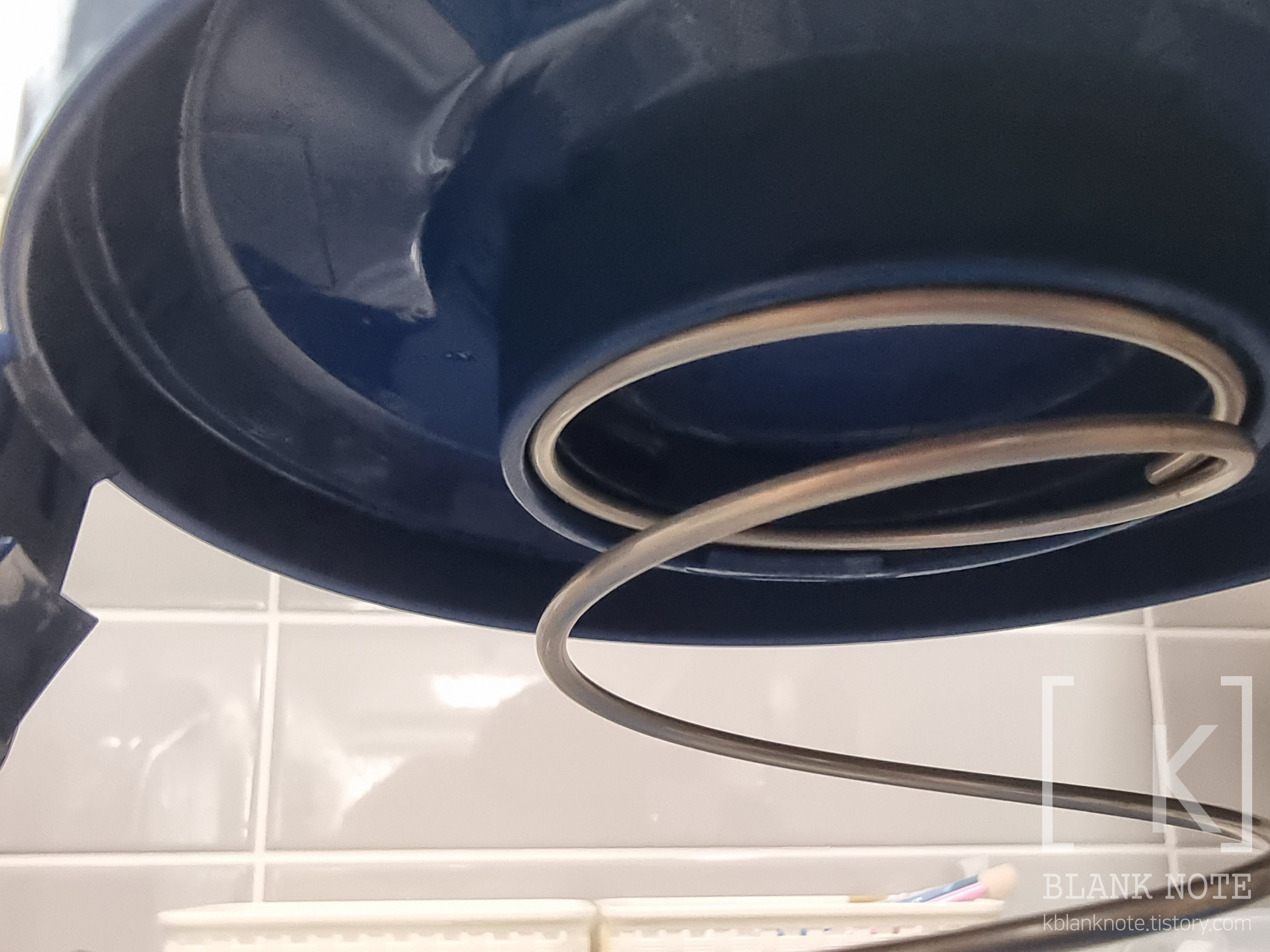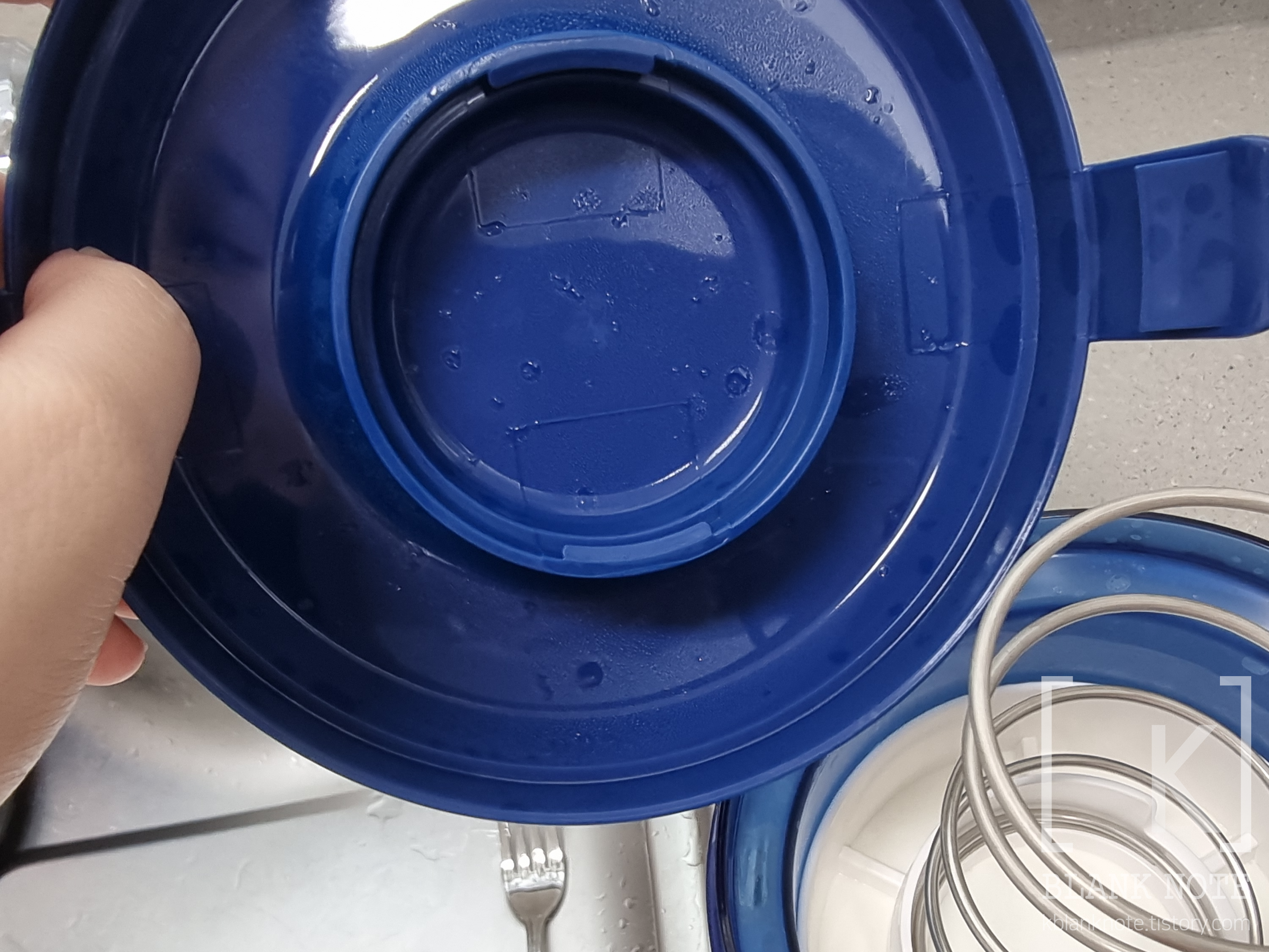 파란색 뚜껑도 안쪽에 보면 저렇게 동그란 홈(?)이 있는데, 스프링의 윗부분을 저기에 잘 맞춰서 눌러줄 것이다 (끼워넣거나 그럴 필요는 없다) .