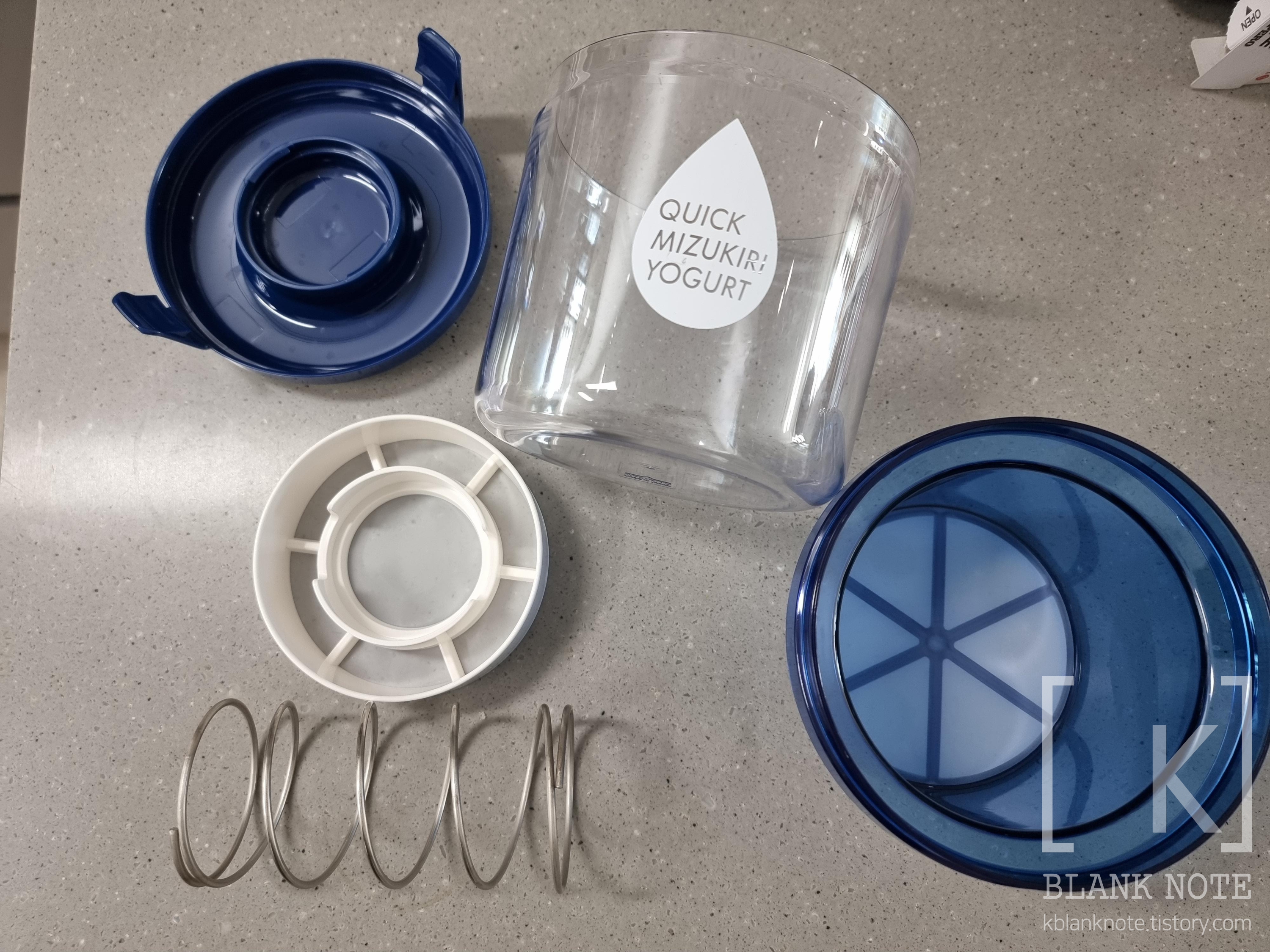 유청을 비운 후 다시 요거트를 담은 통을 넣어주고, 저렇게 하얀 누름망 가운데 스프링을 위치시킨다.