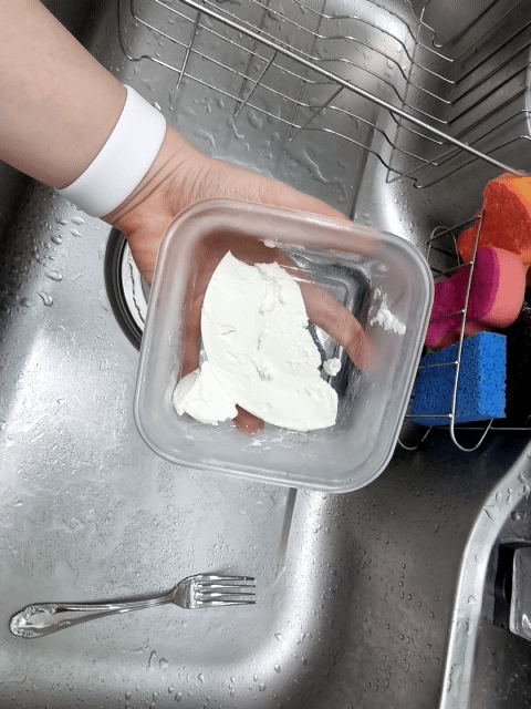 일단 분리된 유청을 버려주기 위해, 한 손으로 파란 통을 꺼내서 들어주고 다른 손으로 유청을 버려준다. 분리된 유청으로 리코타 치즈를 만들 수 있다곤 하는데, 다른 재료를 또 사야하기도 해서 나는 굳이 만들어 본 적은 없다. 유청으로 세안을 한다는 얘기도 들었지만 굳이...라는 생각에 이것 역시 시도해본 적 없음.