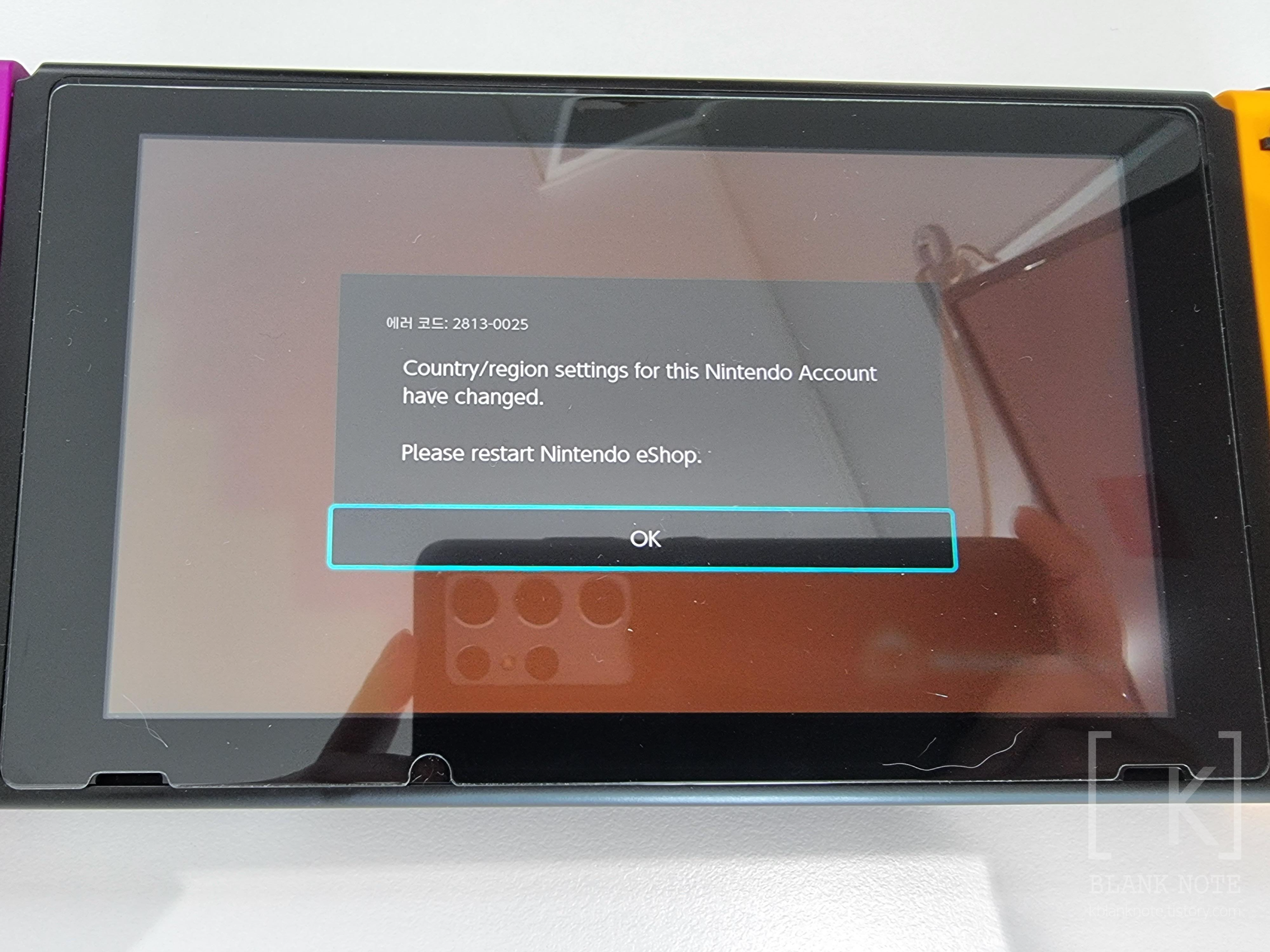 그렇게 변경 완료하고 닌텐도 스위치를 켜서 e숍을 들어가 보면, 저렇게 안내가 뜬다. 재시작을 해주면....