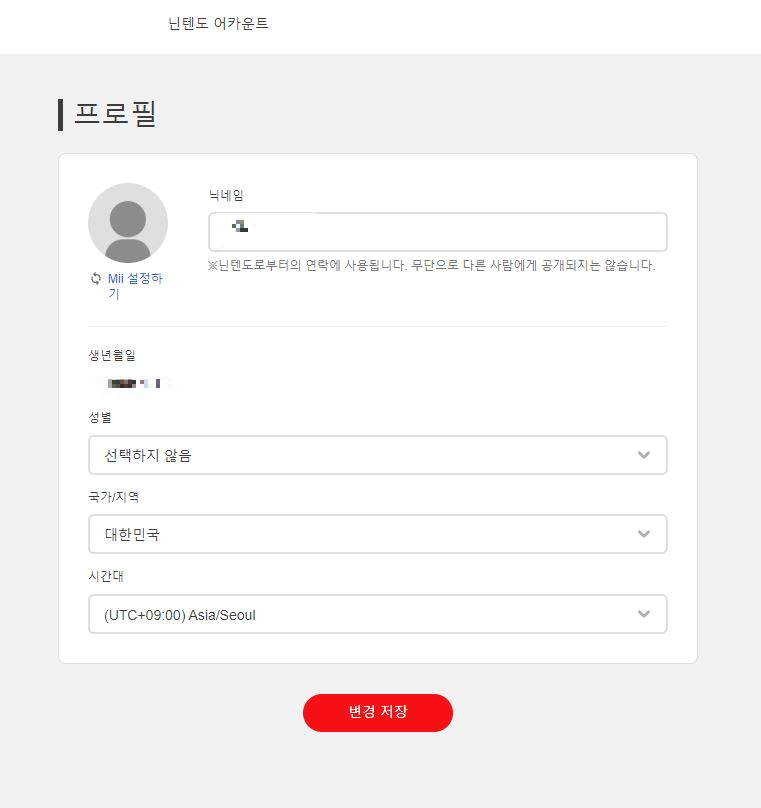 위의 "변경"을 누르면, 이렇게 프로필 변경 창이 뜬다. 저기서 가운데 "국가/지역"부분에서 자신이 변경하고자 하는 국가로 선택하고, 하단의 변경 저장을 누르면 닌텐도 스위치 계정 국가 변경 끝!