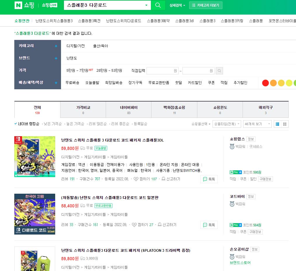 DL (다운로드) 버전 구매는 닌텐도 내 e숍에서 바로 해도 되지만, 보다 싸게 구매하려면 온라인에서 다운로드 코드를 구매하는 것이 낫다. 네이버에서 "스플래툰3 다운로드"라고만 검색했는데도 이렇게 주르륵 판매 페이지가 뜬다.