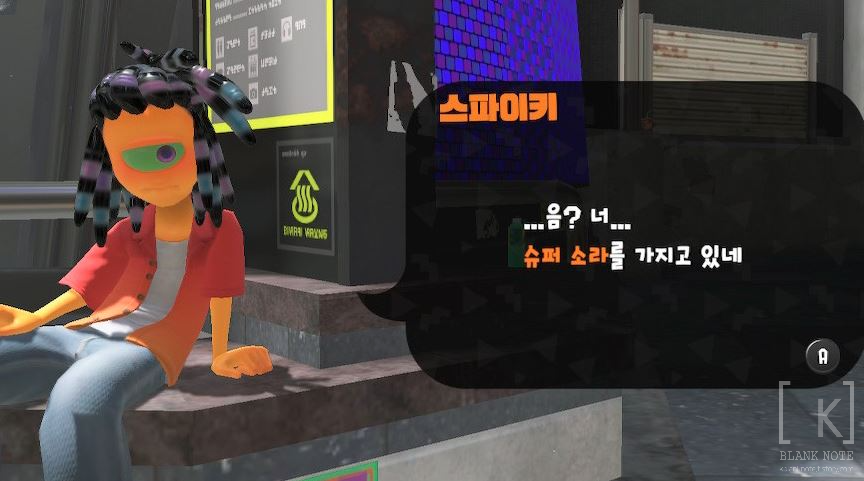 기념으로 슬롯이 2개짜리이던 기어에 레어도 업을 시켜 슬롯을 3개로 만들어줬는데, 슬롯 하나 뚫는데 슈퍼 소라 하나만 요구하더라구요. 스플래툰 전작들에서는 레벨이 높을때 레벨업을 하면 슈퍼 소라를 줬던 것 같은데, 들리는 풍문으로는 이번 스플래툰3에서는 레벨업으로 슈퍼 소라를 얻을 순 없고 페스로만 얻을 수 있다고 합니다. 대신 페스는 한달에 한 번 정도 있을것 같다는 예측이 있네요.