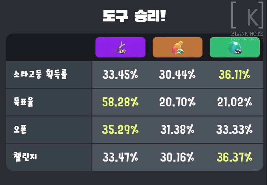 다음은 득표율! 도구파가 58.28%로 다소 압도적인 우위를 점했네요! 어쩐지 도구파인데도 도구파 매칭이 잦더라니... 같은 도구파 매칭될때마다 "친선전이네 하하하" 하면서 했었는데 도구파가 많긴 했나봅니다.