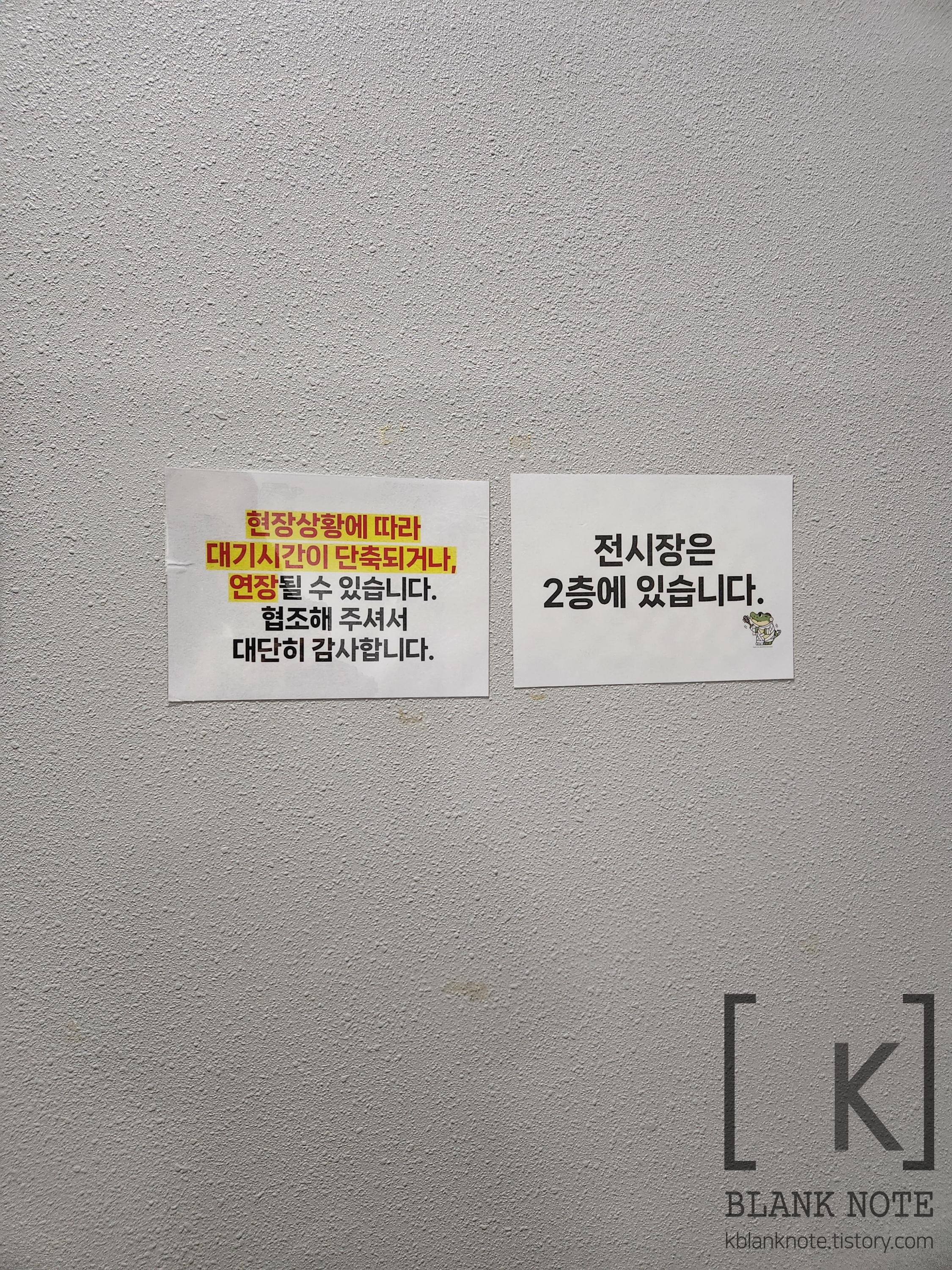 전시회장으로 올라가는 계단 중간 벽면에 이런 안내가 붙어있다. 실제로 주말에는 오픈 시간대에 가도 대기 줄이 생긴다고 한다 (리뷰들에서...) 내가 간 평일 오전에는 그렇진 않아서 바로 전시회장 입장이 가능했다. 주말에 갈 경우 3층도 확인해서 대기를 걸어둬야 한다고.... 만약 헷갈린다면 안내 요원이나 접수처 직원분에게 대기 어디서 걸어둬야 하는지 꼭 물어보고 대기를 걸도록 하자.