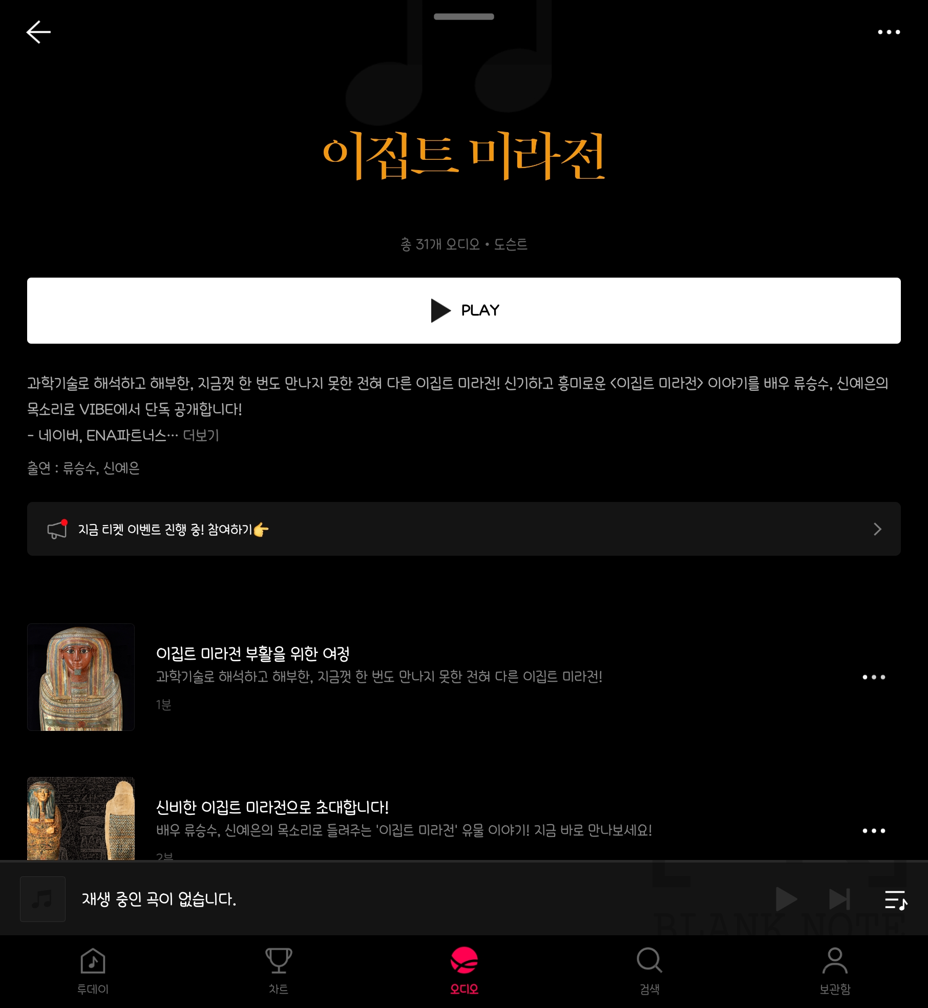 과학기술로 해석하고 해부한, 지금껏 한 번도 만나지 못한 전혀 다른 이집트 미라전! 신기하고 흥미로운 <이집트 미라전> 이야기를 배우 류승수, 신예은의 목소리로 VIBE에서 단독 공개합니다! -